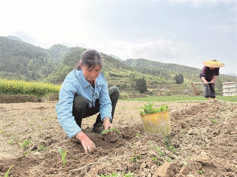 4月10日,龙山县石牌镇大塘社区,村民们正在种植玉米苗。春耕时节,该镇全力抓好春耕生产,组织群众抢抓农时进行春耕、春播、春管,为农业增产增收提供保障。 团结报全媒体记者 余江明 杨帆 摄