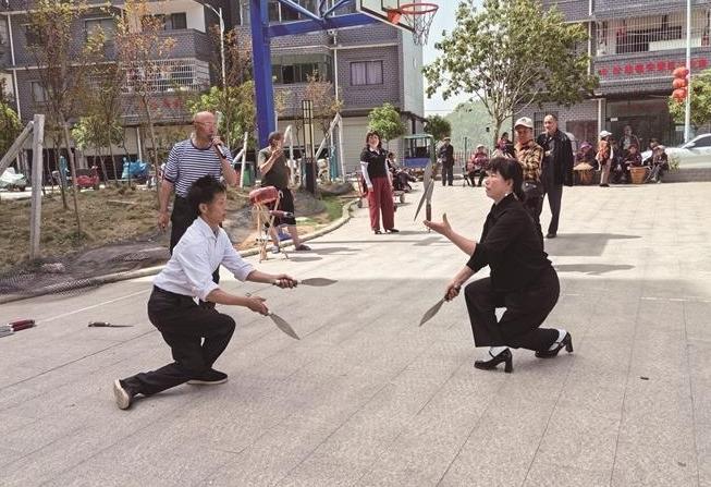 4月14日,在永顺县松柏镇安置区,非遗传承人正在表演抛刀技艺。该镇文化底蕴丰厚,群众闲暇时相聚一起唱山歌,表演汉戏、九支鞭、渔鼓筒、摆手舞等,传承非遗文化,乐享幸福生活。 罗远程 雷夏铭 摄