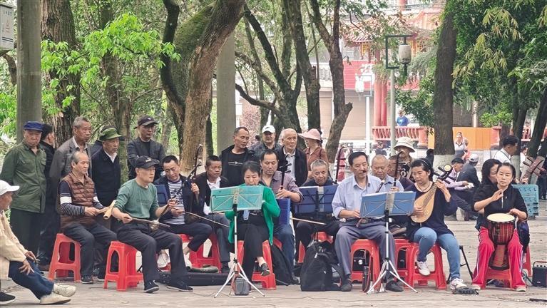近日,春光明媚,吉首市峒河游园里,由老年朋友组成的小乐团正在认真排练,悠扬的乐曲怡人,吸引了不少市民群众驻足欣赏。 团结报全媒体记者 杨继东 摄