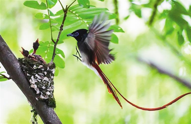 夏日,湘西高新区湾溪河畔的林木间,一只绶带鸟翩跹而至,尾羽飘若锦带,两只幼鸟从巢中探出头欢快相迎,上演一幕和谐动人的生态乐章。 团结报全媒体记者 张谨 摄