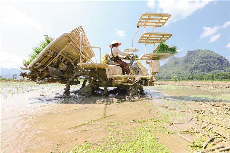 6月13日,龙山县召市镇前卫村,农机操作手驾驶插秧机进行插秧。“三夏”时节,当地农民收割油菜后抢抓农时对水稻进行种植和管理,为粮食丰收打下基础。 曾祥辉 摄