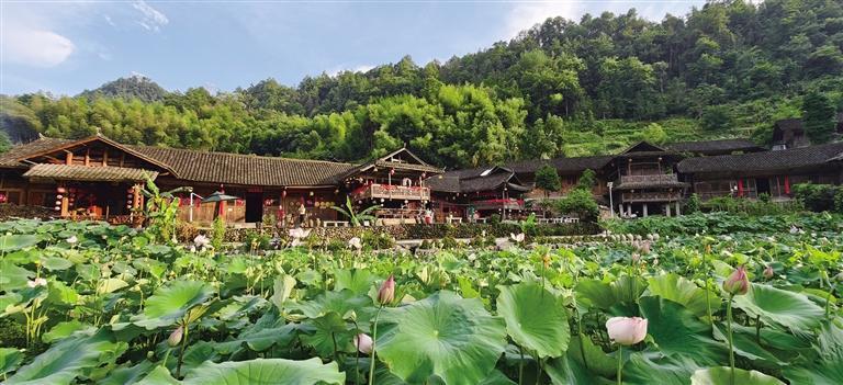 7月7日,龙山县红岩溪镇头车村大字沟古寨荷花盛开。大字沟古寨已被列入中国传统村落名录。古寨里土家族吊脚楼依山而建,小溪穿寨而过,竹林摇曳掩映其间。该古寨经过改造,老旧建筑焕然一新,内部改建成简朴民宿,吸引众多游客前来观光休闲度假。 团结报全媒体记者 张谨 摄