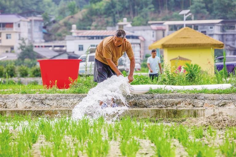 7月17日,龙山县召市镇红卫村,农民在抽水浇灌稻田。为缓解连日来高温少雨天气对农作物生长造成的不利影响,当地农民及时引水浇灌农田,确保粮食收成。 曾祥辉 摄