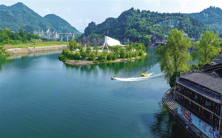 9月16日,花垣县边城镇清水江,江水澄澈,游客正在体验水上游乐项目,特色吊脚楼成打卡点。 团结报全媒体记者 杨贤清 摄