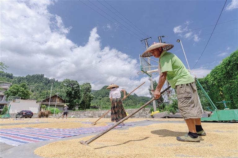 9月17日,吉首市矮寨镇聚福村,村民在晾晒丰收的稻谷,确保颗粒归仓。 团结报全媒体记者 杨帆 余江明 摄
