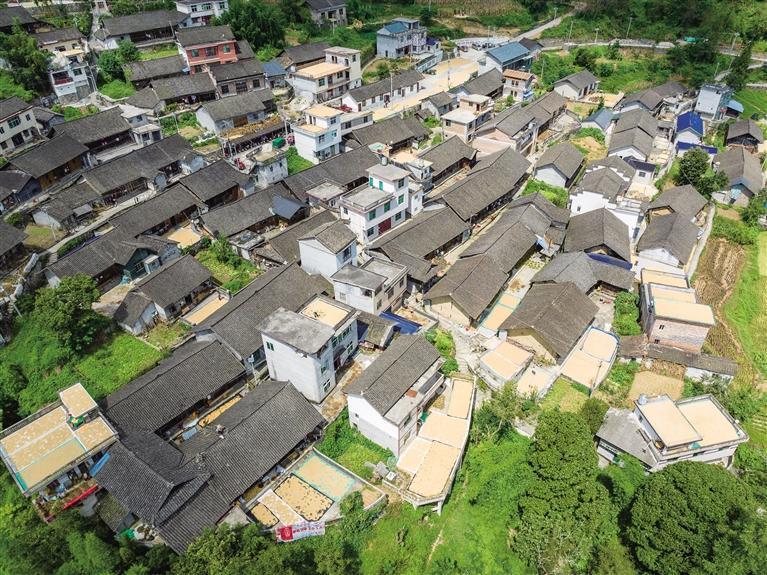 9月16日,花垣县双龙镇双龙村,村民趁着晴好天气在院坝和屋顶晾晒收获的稻谷、玉米、黄豆等农作物,“晒秋”场景与古朴苗寨相映成趣,呈现一派丰收图景。 彭璟 摄