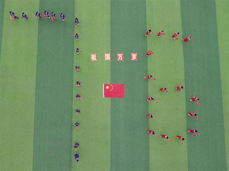 9月30日,保靖县清水坪学校的师生与国旗合影,表达对祖国的热爱和美好祝福,迎接国庆节的到来。 俞采华 易晗 摄