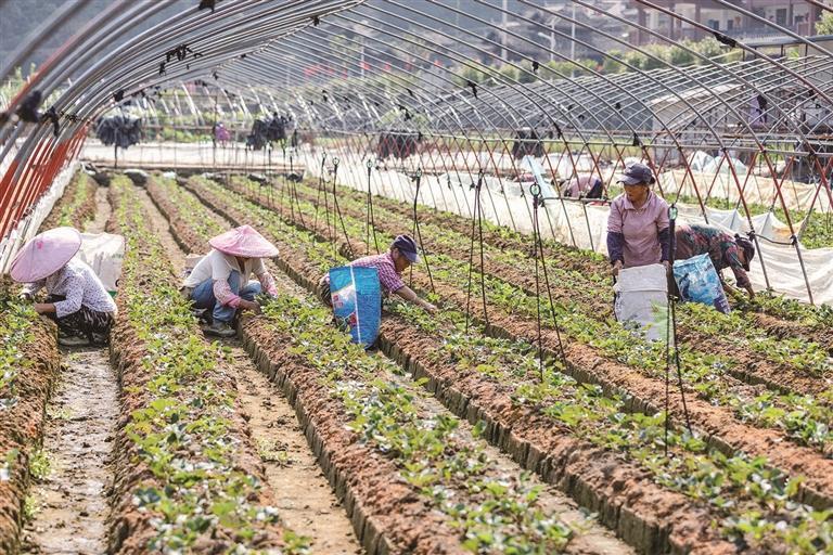 近日,吉首市矮寨镇坪朗村,村民忙着对草莓苗进行管护。当前正是草莓生长的关键期,农户通过田间精细化管理,确保草莓丰产,助农增收。 彭璟 摄