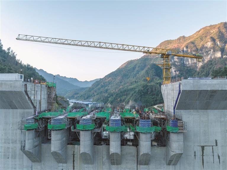 11月28日,吉首市矮寨镇大兴寨水库工程建设现场,工人正在进行8#9#溢流坝段施工。初冬时节,工程建设单位科学调度施工力量,利用晴好天气和枯水期窗口,确保重点水利工程按计划高效推进。 彭璟 摄
