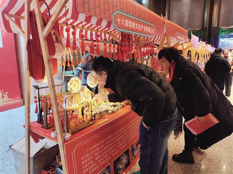 1月5日,在广西壮族自治区南宁市举行的南宁湘西商会成立庆典、第二届异地湘西商会年会暨湘西自治州(南宁)招商引资推介会上,特色农产品展销区展销着湘西特色粮油果蔬、农产品及非遗产品等,引来各地企业代表竞相咨询采购。通过展销,让湘西的特色农产品走出湘西、链接东盟、面向世界。 团结报全媒体记者 彭弘 摄