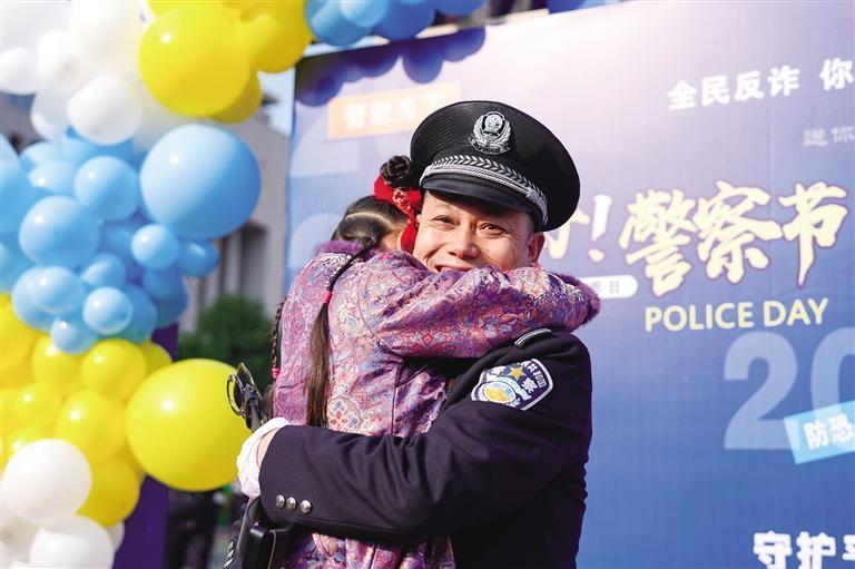 一名小姑娘为警察爸爸送上节日祝福,并给了他一个大大的拥抱。 团结报全媒体记者 杨贤清 摄