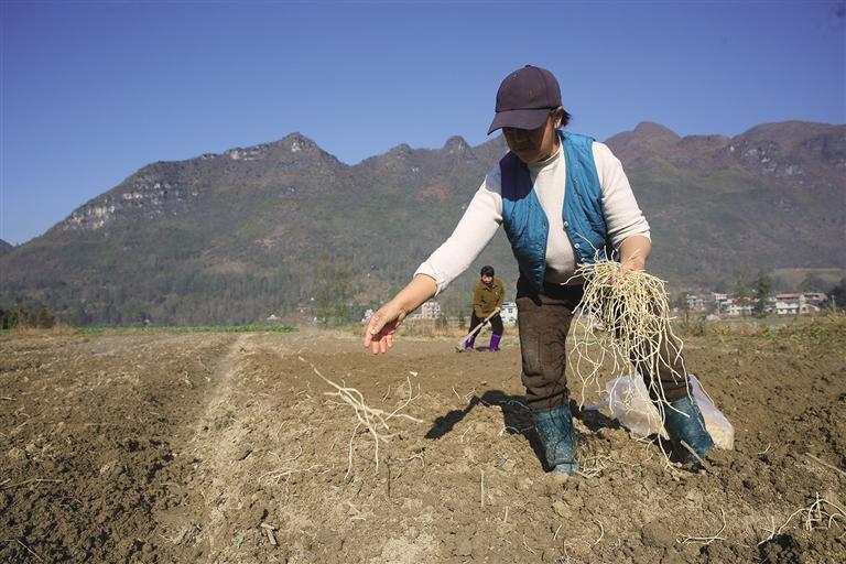 1月7日,龙山县召市镇前卫村,村民在地里栽种折耳根。折耳根又名鱼腥草,既是食材也是药材,种植周期短,市场销路稳,近年来,当地不少农民通过规模种植折耳根,盘活闲置土地,拓宽增收渠道。 田礼成 摄
