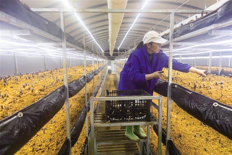 近日,吉首市乾州街道三岔坪村食用菌基地,村民在采摘黑皮鸡枞菌。该村建设了24个标准化食用菌生产大棚,采取“企业+村集体经济+农户”合作模式,推动食用菌产业规模化、标准化、集约化、品牌化、融合化发展,致力将菌菇产业打造成为强村富民的支柱产业。 彭璟 摄