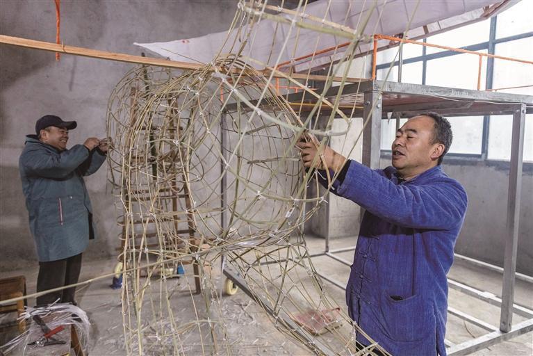 1月29日,吉首市乾州街道漩潭社区,“乾州春会”省级代表性传承人与民间艺人在进行“扎春”制作。连日来,团队精心赶制十二台“春”的扎作,为农历马年“乾州春会”民俗活动做准备。“乾州春会”是湖南省非物质文化遗产代表性项目,已成为当地新春佳节展现湘西特色民俗的文化盛宴。 彭璟 摄