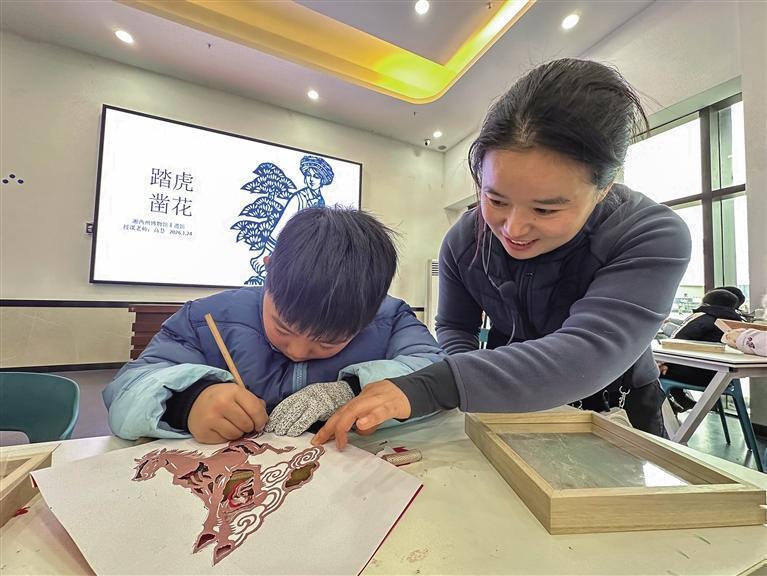 1月24日,游客在湘西州博物馆体验国家级非遗项目“踏虎凿花”技艺。1月17日至31日,湘西州博物馆启动“神秘湘西过大年”新春文化体验季活动,期间所有体验项目均面向市民与游客免费开放。 团结报全媒体记者 施雨润苗 摄
