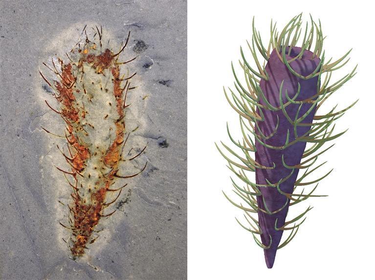 花垣生物群叶足动物-柯林斯虫化石图(左)和复原图。 新华社发