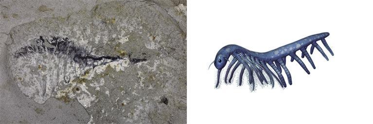 花垣生物群射齿类节肢动物-赫德虾类化石图(左)和复原图。 新华社发