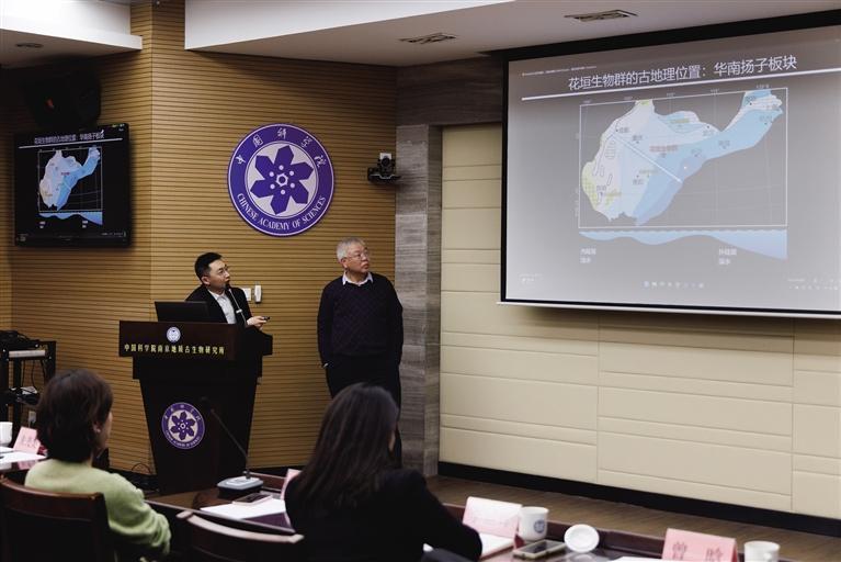 1月22日,在中国科学院南京地质古生物研究所举行的发布会上,中国科学院院士、研究员朱茂炎(右)和副研究员曾晗就花垣生物群的发现回答媒体提问。 中国科学院院士、中国科学院南京地质古生物研究所研究员朱茂炎团队联合其他单位科研人员,在湖南省湘西土家族苗族自治州花垣县境内进行持续五年系统的野外化石发掘工作,从单一采坑中累计采集超过5万件化石标本,分类鉴定出153个动物物种,其中59%为新物种,涵盖了16个动物门类。花垣生物群的发现和科学意义,填补了寒武纪生命大爆发之后关键时段全球顶级软躯体化石群缺失的空白,揭示了显生宙第一次生物大灭绝事件前后全球海洋生态系统的转变。 相关研究成果于北京时间1月29日在《自然》(Nature)发表。 新华社记者 金立旺 摄