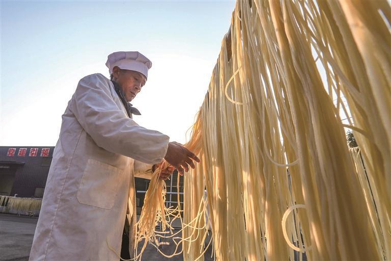 近日,龙山县召市镇双进社区,村民在晾晒手工制作的红薯粉条。召市红薯粉条因口感细腻、营养丰富、劲道耐煮而深受消费者喜爱。春节临近,当地村民忙着制作红薯粉条,供应节日市场。 曾祥辉 摄