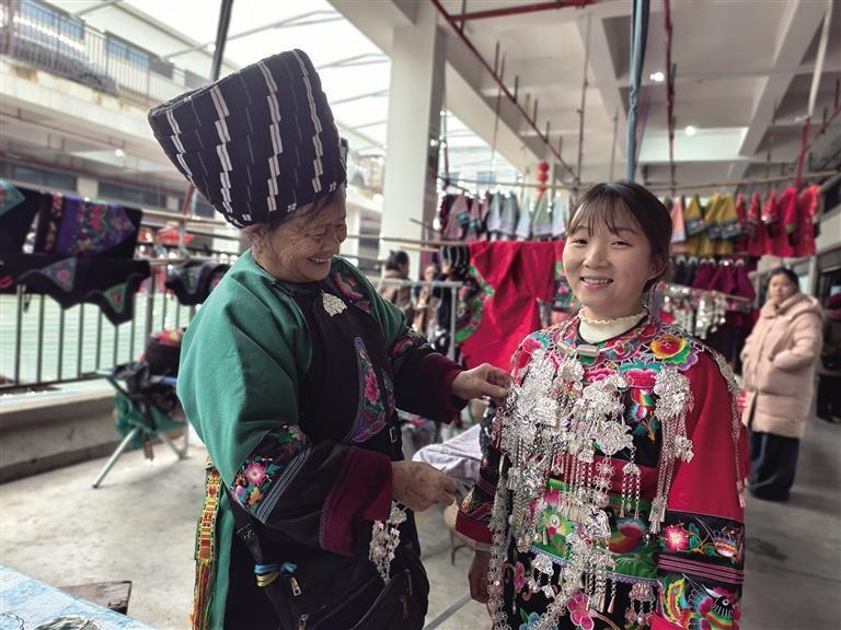 2月1日,吉首市乾州农贸市场的民族服饰销售摊位客流如织。一位来自凤凰县吉信镇的苗族姑娘正在为自己即将到来的婚礼挑选传统嫁衣,在浓浓的年味里,尽显苗家儿女对幸福生活的美好期盼。团结报全媒体记者 麻垣杰 摄