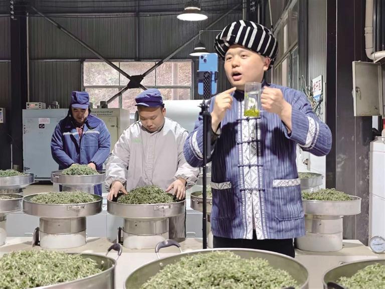 近日,保靖县葫芦镇大岩村“林茵茶业”加工车间里,网络主播在直播带货。据了解,春茶开采以来,直播间平均每天销售额超一万元,预计清明期间,销量会更好。团结报全媒体记者 朱开朗 摄