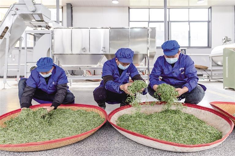 日前,吉首市马颈坳镇隘口村苗疆茶业科技有限公司生产车间内,茶农在赶制春茶。近期,该村万亩湘西黄金茶进入春茶采摘期,茶农们抢抓农时采摘鲜叶、制作新茶,供应市场。彭璟 摄