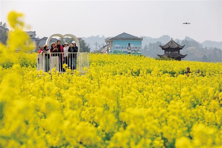 3月12日,泸溪县潭溪镇大陂流村,游客在油菜花海打卡拍照。金色的花海与错落的村庄、蜿蜒的峒河交相辉映,构成一幅诗意盎然的春日画卷,吸引众多游客前来踏青赏花、休闲游玩。 彭 璟 摄