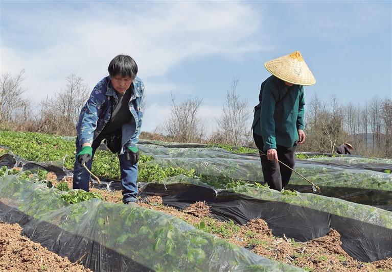 3月14日,花垣县花垣镇道二村土豆种植基地,村民在为土豆苗揭膜、除草,抢抓农时进行管护。 龙艾青 摄