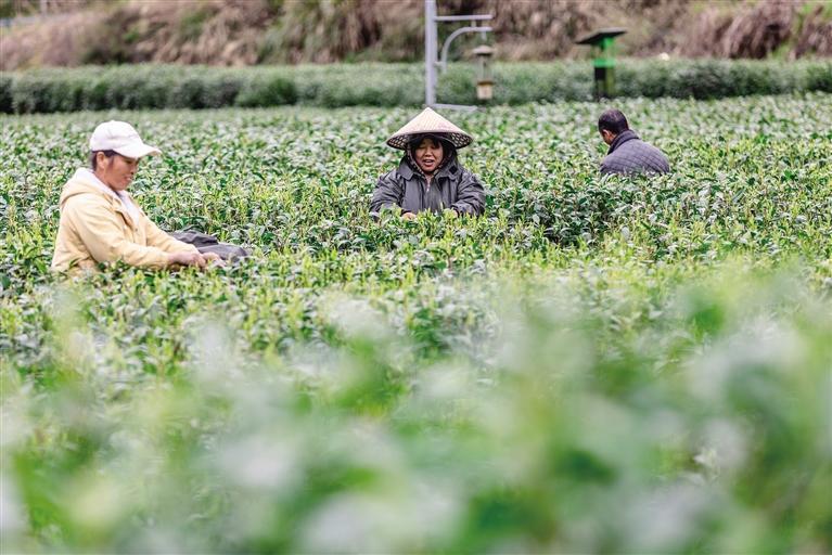 近日,吉首市矮寨镇坪年村连片茶园,鲜嫩茶芽满枝头,采茶工人忙碌地穿梭在茶垄间,指尖翻飞,抢抓时节采摘明前茶。 团结报全媒体记者 杨帆 摄