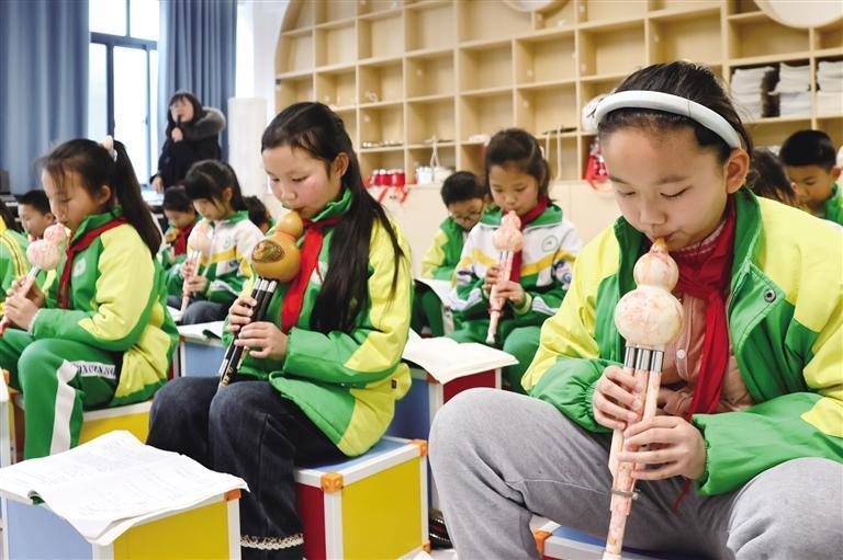 3月26日,湘西州砂子坳小学学生在课后服务中吹奏葫芦丝。近年来,该校通过开设葫芦丝、苗鼓、古筝等特色社团,将中华传统文化贯穿教学全过程,让学生在浸入式的课程中感受中华优秀传统文化的魅力。 彭彪 摄