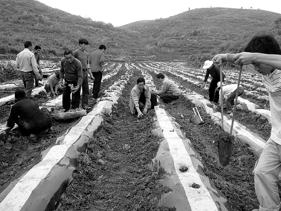 龙山县大力发展科学种烤烟这一支柱产业,以利壮大全民经济,积极引导广大农民投身于新农村建设。图为4月29日,该县有名的烤烟专业村———靛房镇万龙村烟农们正在移栽烟苗。 向卫华 王久荣 摄
