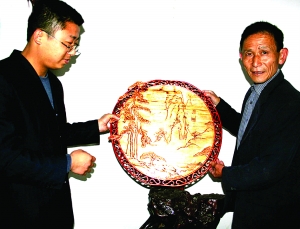 5月2日,湘西盆景协会理事、龙山县盆景协会副会长张太春在自己家中,展示向国庆六十周年献礼的圆形浮雕木刻作品《秀》。