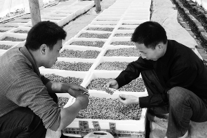5月4日,保靖县毛沟镇白坪村种养大户刘波(右)与会员一起了解芽菜生长情况。2008年底,刘波自费在外学习蔬菜高效无土栽培技术,回乡后在县民政局、老区办的大力支持下,投资10万元,在白坪民政果园建起了绿色无公害的“白坪村蔬菜生产基地”,日前已成功培育了西红柿、辣椒及芽菜系列,投放市场后,供不应求,获得了很高的经济效益,填补了该县蔬菜高效无土栽培的空白。 彭 达 摄