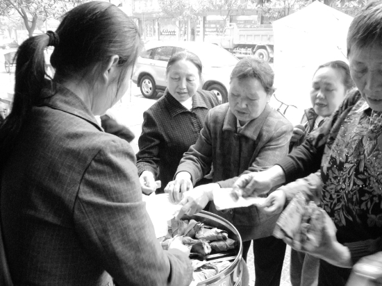 永顺县下岗职工彭继富看准绿色产品市场,挖掘地方特色小吃,在该县青坪镇开设了青天坪包谷粑粑加工厂。目前该产品销售情况良好,已在长沙、张家界、吉首市及自治州各县市等开设24个代售点。彭继富的粑粑加工厂已带动返乡农民工和下岗失业人员70多人实现再就业。图为广大市民在青天坪包谷粑粑永顺县城销售点抢购的热闹场面。 吴晓敏 唐启武 摄