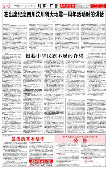 在出席纪念四川汶川特大地震一周年活动时的讲话