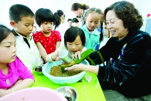 5月22日,苏州市虹桥幼儿园的小朋友在跟奶奶学包粽子。