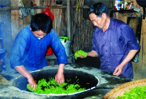 今年68岁的戴贵熬,是保靖县葫芦镇黄金村传统炒制“黄金茶”的老艺人,炒制茶叶技龄已有50多年历史了。近几年来,随着年龄一年年增大,老人将传统炒制“黄金茶”技术传给了两个儿子,让儿子掌握了传统炒制“黄金茶”技术。图为戴贵熬(右)在指导儿子炒制茶叶。 向万银 摄