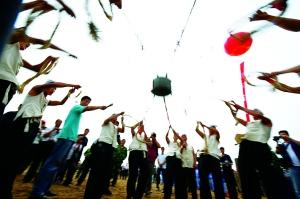 5月27日,一群汉子在黄河岸边表演“黄河号子”。