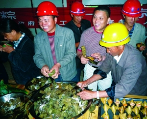 5月27日,桃花镇观洲村建筑工地的农民工在品尝粽子。