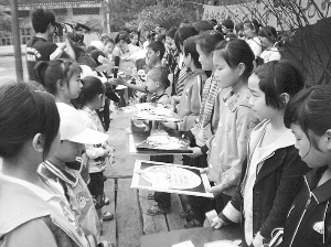 5月30日,吉首市艺华美术学校的小朋友们在吉首市商业城对自己精心绘制的美术作品、手工艺品进行义卖,并把所得9480元的义卖款全部捐赠给了本市边远山区社塘坡乡土家苗寨的39 位贫困学生。图为社塘坡学校的贫困学生们(右排)在“六一”儿童节当天接受艺华美术学校小朋友们捐赠时的情景。
