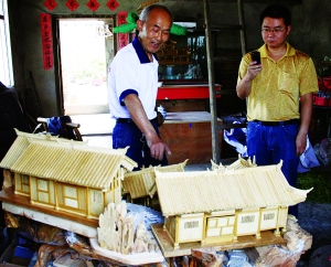 6月5日,湖南省工艺美术大师、著名土家族竹雕艺术家、龙山县72岁的土家族退休教师王仕辉(左),在家中向客人介绍以土家族特色建筑为题材、为国庆60周年献礼而创作的大型土家竹雕作品,并面向社会公开为献礼作品征名。
