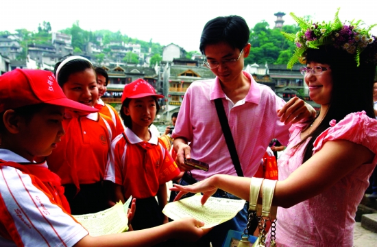 6月10日,凤凰县城区200多名少先队员在古城景区开展“红领巾文明倡导员”社会实践活动签名。该县城区学校为了积极开展“好风景、好环境、好心情,游客满意在凤凰”活动,在少先队中建立“红领巾文明倡导员”,用红领巾文明的形象做榜样,带动市民文明生活,引导广大市民和游客共同维护旅游的发展环境。 图为 在沱江河景区,游客与“红领巾文明倡导员”一起交流,共