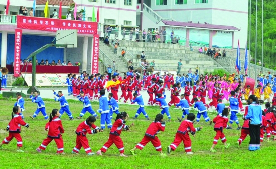 弘扬民族艺术,延续土家文脉。6月12日,保靖县在碗米坡镇中心完小举行全国第四个“文化遗产日”盛大庆典仪式。图为土家摆手舞演出场景。 特约记者 彭司进 摄
