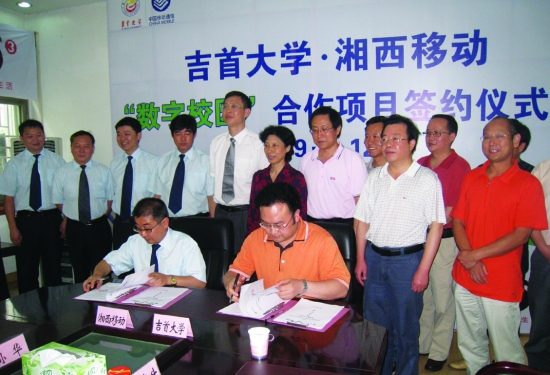 经沟通洽谈,吉首大学与湘西州移动分公司携手合作,建设吉首大学校园数字化项目,包括“校园一卡通”系统、卡务中心、数字校园基础平台、数据中心、数字迎新系统、校园OA系统、移动信息化平台。6月12日上午,该项目签约仪式在吉首大学举行,湘西州移动分公司总经理吴仕海(前左)与吉首大学副校长曹晓鲜(前右)在仪式上签约。 李冰融 胡桂林 摄