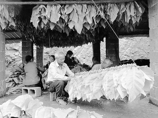 泸溪县达岚镇潮地村返乡农民工谭必安、刘水强在当地政府帮扶下,今春在潮地村新开的柑橘基地里共栽种烤烟270亩、种植玉米70亩。入春以来,他俩请来周边寨子的男女劳力整地起垄、盖膜栽苗、烟苗培管、采摘烘烤等,致富的同时也给周边百姓带来经济收入。图为打工村民在工棚里编扎烟叶。 吴代清 摄