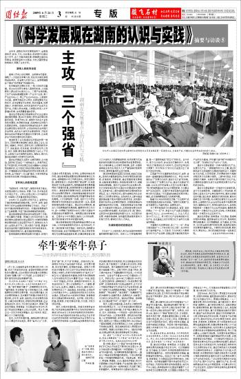 专家简介 谭跃湘,1958年出生,1981年毕业于湖南师范学院政治系,现任中共湖南省委讲师团教学科研处处长、教授,系省重大决策理论咨询委员会委员、省宣传文化系统首批“五个一批”人才、省经济学学会副理事长兼秘书长、湖南社会科学院特约研究员。长期致力于马克思主义理论的研究、宣传、教育,在《求是》、《人民日报》、《光明日报》等省级以上报刊公开发表理论文章100多篇。 湖南日报记者 朱永华 6月17日,记者就我省科学发展主攻方向一问题,采访了我省资深学者、省委讲师团教学科研处处长谭跃湘。这位长期参与我省重大决策理论咨询的“智囊人物”一打开话匣,让记者感到了一股扑面而来的自信和激情气息。 问:近年来,我省确立了建设“三个强省”的主攻方向,你认为确立这一主攻方向的依据是什么? 答:“牵牛要牵牛鼻子”,发展要明主攻方向。“富民强省,科学跨越”奋斗目标确定之后,关键是要抓住发展的主要矛盾,突出发展的重点,抢占发展的制高点,在关键环节和重点领域率先实现突破。近年来,省委、省政府以科学发展观为指导,认真总结发展经验,积极探索发展规律,在全面推进经济、政治、文化和社会建设中,明确了建设经济强省、教育强省、文化强省的主攻方向,形成了我省在发展重点上的认识成果。我认为,确立这一主攻方向和发展重点,至少有历史、现实、理论三个方面的依据。 首先,从历史依据来看。湖南至明代便已成为人口稠密的农业地区,素有“鱼米之乡”之称,享有“湖广熟,天下足”的美誉。改革开放以来,湖南作为农业大省在曲折中前进、在发展中提高,有丰收的喜悦,有贡献的自豪。但现代文明的进步和繁荣,仅仅立足于农业传统的发扬光大是难以为继的。改革开放前湖南作为“鱼米之乡”尚在为人们温饱发愁的窘境;改革开放初期湖南人在与东部经济交往中遭遇“送去一车猪,拖回一车水”的尴尬;多年来,湖南面对前有标兵、后有追兵的压力,使人们逐渐明白了一个道理:要在工业化、信息化、城镇化、市场化、国际化深入发展新形势之下,急起直追、后发赶超,必须始终以经济建设为中心,全面推进经济政治文化和社会建设,实现由农业大省到经济强省、教育强省和文化强省的根本性转变。经济强,才能实现人民富;教育强,才能支撑经济强;文化强,才能引领经济强。 其次,从现实依据来看。改革开放使我省实现了经济体制由高度集中的计划经济体制向充满活力的社会主义市场经济体制的历史性转折、对外关系由内陆封闭半封闭社会向全方位开放社会的历史性突破、经济结构由农业主导向工业主导的历史性转型、社会事业由发展滞后向与经济协调发展的历史性转变、民主法制建设的历史性进步,极大地调动了人民群众的主动性、积极性和创造性,极大地解放和发展了社会生产力,极大地凝集了民心、实现了民利、改善了民生,使三湘大地发生了天翻地覆的历史巨变。1978年到2008年,全省生产总值由146.99亿元增加到1.1万亿元,财政总收入由28.98亿元增加到1300多亿元;新世纪新阶段,湖南教育步入快速发展的“黄金期”,区域教育竞争力位居全国前列,正大步迈入中部经济强省行列;我省文化产业抢得先机,催生了湖南文化品牌群体性崛起,“电视湘军”、“出版湘军”、“报业湘军”、“演艺湘军”、“动漫湘军”已成为湖南引以自豪的亮点、品牌和名片,也彰显了文化软实力的经济优势。建设经济强省、教育强省、文化强省遇“天时”、存“地利”、有“人和”。 再次,从理论依据来看。马克思主义唯物史观和科学发展观认为,人们只有首先解决吃喝住穿这样一些基本的生存问题,才有可能从事政治、科学、艺术、宗教等等;一个民族在一定阶段的生活资料生产活动,以及相关要素,便构成为经济基础,人们的国家制度、法的观念、艺术以至宗教的观念,就是从这个基础上发展起来的,也必须由这个基础来解释。科学发展观是以人为本、全面协调可持续的发展观,联系湖南实际深入贯彻落实科学发展观,既要以经济建设为中心,建设经济强省;也要全面协调,建设教育强省和文化强省。 问: 建设“三个强省”的口号大家都比较熟悉,但真正理解建设“三个强省”的丰富内涵,则要下很大的功夫。能就此谈谈你的认识吗? 答:的确,建设“三个强省”的内涵非常丰富,我们对它的认识也处在不断深化的过程之中,我认为首先要从质和量的统一中把握建设“三个强省”的丰富内涵。任何事物都是质和量的统一,建设三个强省也有质和量的规定性。只有从质和量的统一中把握和明确其内涵,才能更全面、更深入、更准确、更清晰。比如,建设经济强省,我们不仅要明确人均经济总量强、产业结构强、增长方式强、人民生活强这样一些质的规定,而且要了解它的数量要求。教育强省和文化强省也是这样。 其次,要从历史发展的趋势中把握建设“三个强省”的丰富内涵。建设三个强省是一个不断发展的历史过程,在不同历史时期和不同发展阶段应有不同的要求,因此,我们对它的认识,也要不断深化。 最后,要从横向比较分析中把握建设“三个强省”的丰富内涵。建设强省所谓的“强”是一个时空概念,既是一定时序上相比而言的“强”,也是一定空间上相比较而言的“强”。如果说,从时序上说,建设三个“强省”是相对过去、立足