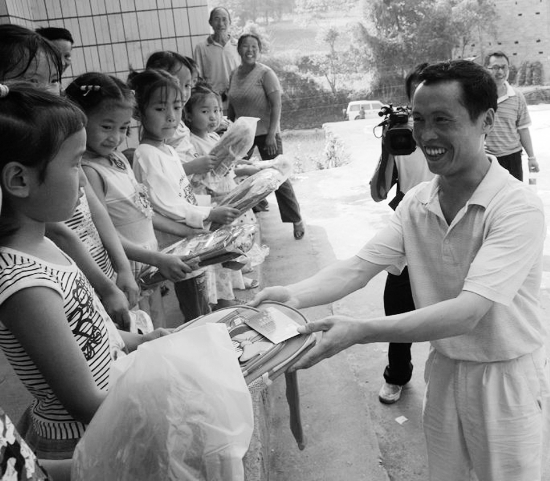 6月19日,在“组工干部下基层活动月”中,花垣县组织部来到长乐乡黄善坪村了解民情,为该村16户贫困户发放扶贫金,并为该村送去远程教育设备一套。图为扶贫队员为学生发放学习用品。 石林荣 石兴国 摄