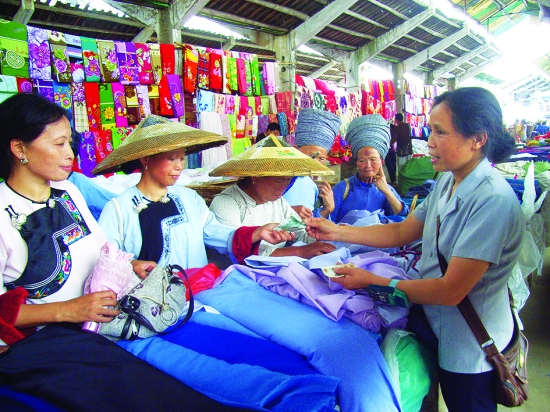 凤凰县工商局用党的优惠政策认真做好返乡农民工的再就业服务,今年以来对临时经营和自产自销的返乡农民工免于工商登记和市场管理费,还经常下乡为农民工通报商业信息和举办相关业务培训。两山苗区的农民工大都走上了商业服务行业,为社会作出了贡献也增加了自己的收入。图为7月10日,禾库镇返乡农民工龙云花的布匹摊上买卖红火。 程明君