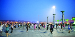 炎热盛夏,吉首市人民广场成了广大市民夜晚休闲健身娱乐的好地方,每当夜幕降临,每天有数千人在这里休闲,很多市民从麻将桌上走了出来,他们在这里散步、跳舞。图为男女老少在广场上欢快地跳健身舞。 本报记者 张谨 摄