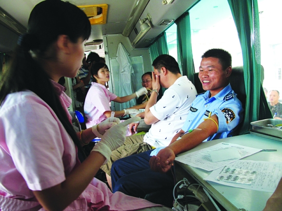 7月29日,吉首市执法局干警 在市政府采血点参加义务献血。据了解,自7月27日至28日两天来,市直机关干部职工共有110人分别在湘泉步行街和市政府两个采血点参加义务献血32800亳升。为缓解入夏以来用血紧张局面,政府号召广大市民和干部职工积极参加义务献血活动。 陈绪新 摄